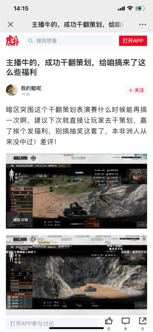 而全程观赛的玩家们,对于主播队成功干翻策划是赞叹不已,纷纷表示干得漂亮,毕竟面对的是每天疯狂亿遍的策划,代入感不要太强,试问谁还没在玩游戏时骂过一句“xx策划”呢!不得不说,暗区官方搞这样一场别开生面的比赛,可谓是用意深远。不但给了玩家一个宣泄对策划愤恨情绪的机会,同时也通过送福利,拉近了官方与玩家之间的关系。