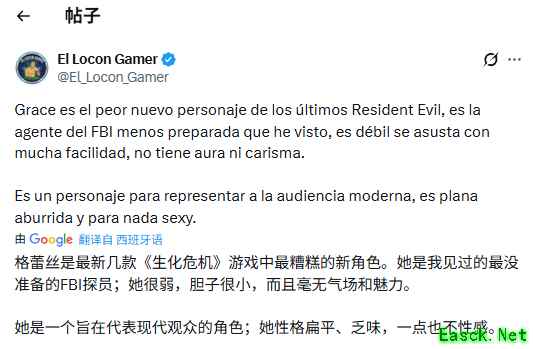 在《生化危机》官方账号的帖子下,格蕾丝同样遭到不少粉丝批评: