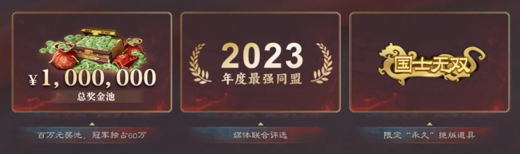 为了表达赛事的诚意,也为了激励玩家参与角逐最强同盟,《三国志・战棋版》准备了总额高达100万元的奖金池。其中获得冠军的最强同盟,可以独占60万元,获得游戏内专属永久称号“国士无双”,以及媒体联合评选的“2023年度最强同盟”荣誉称号!