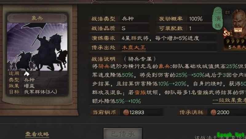 通过传承S3武将木鹿大王获得,其本身具备象兵特性。