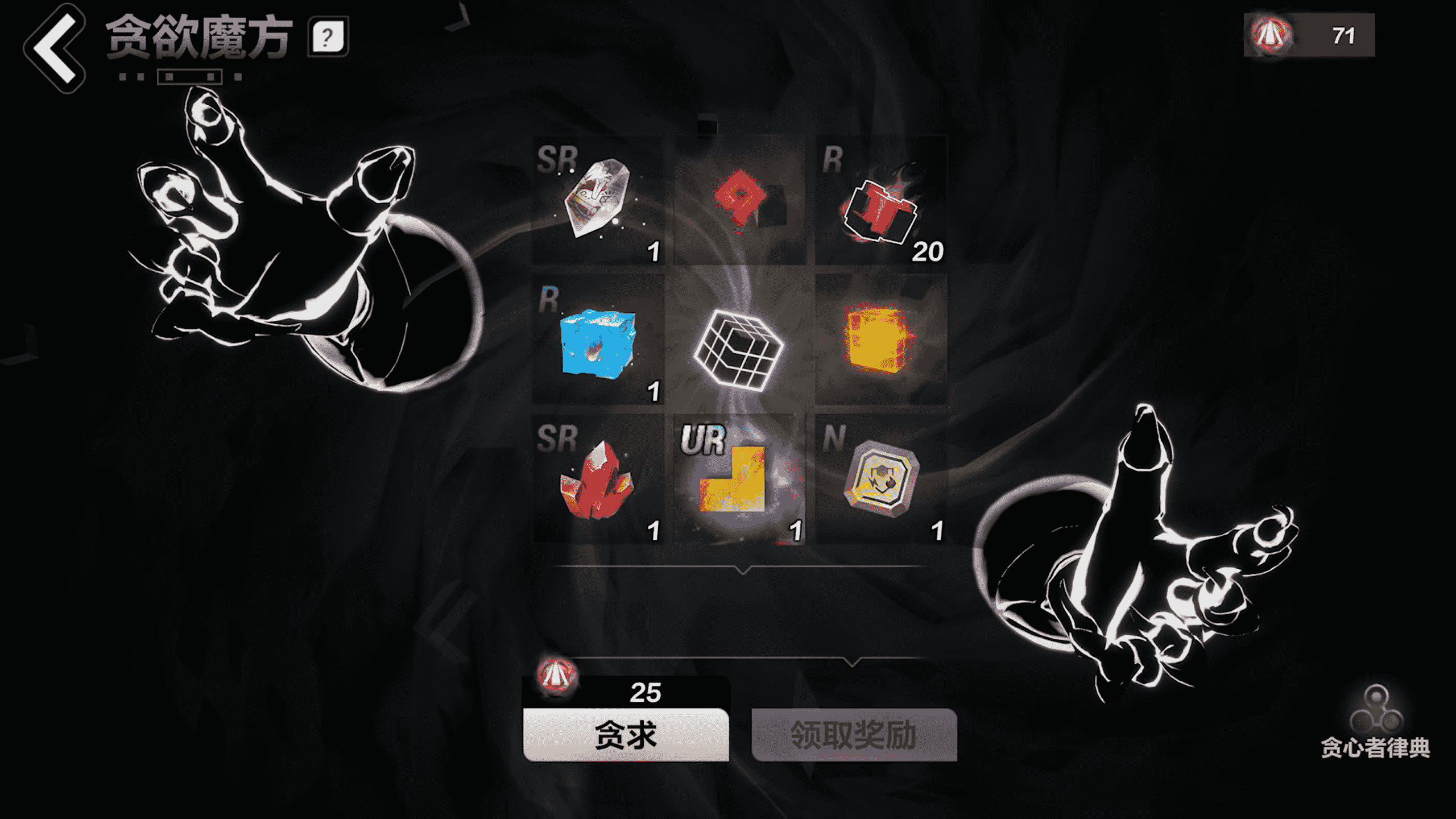 1.“贪欲魔方”里的奖励按照稀有度分为N、R、SSR和UR以及惊喜奖励;