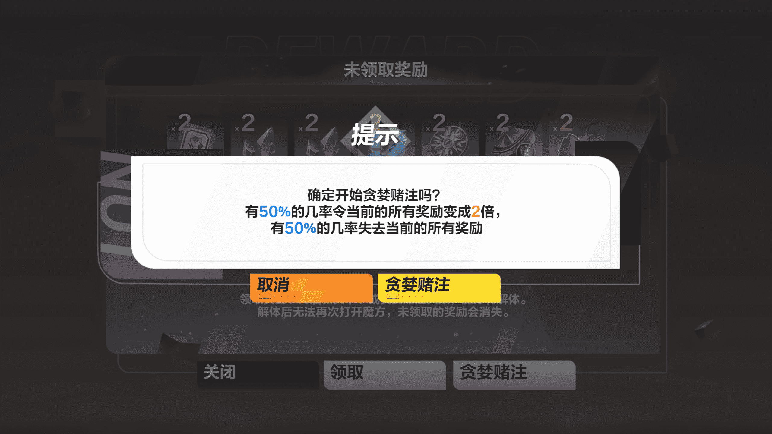 5.抽取结束时有几率触发“贪婪赌注”,选择“选择贪婪赌注”可使到手的奖励变成2倍,也可能失去所有的奖励。