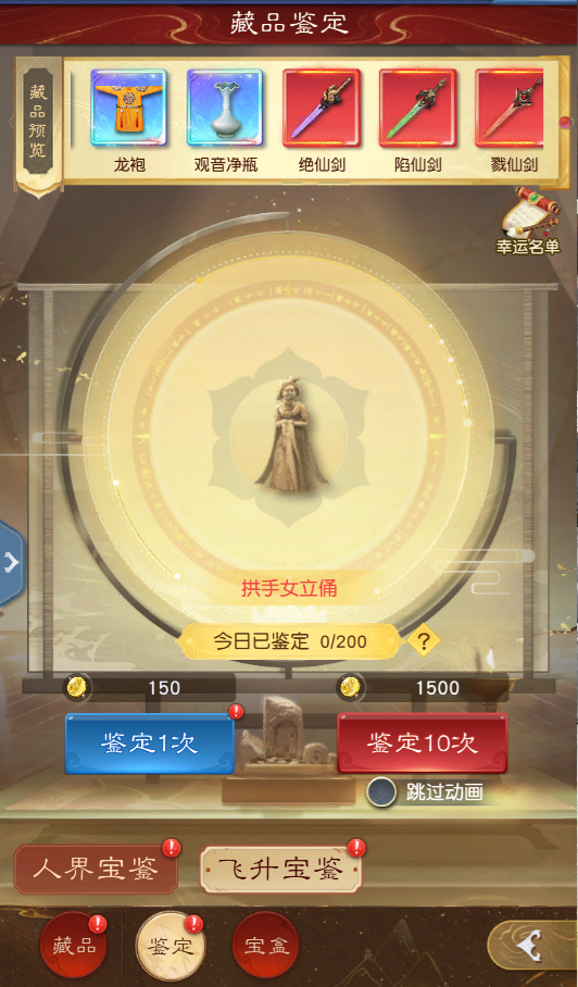 飞升宝鉴是为专属飞升玩家的“鉴定”玩法,少侠们需消耗“飞升藏品币”参与飞升宝鉴的藏品鉴定,飞升宝鉴将有更大几率获得红色藏品,同时也有机会获得白金藏品。