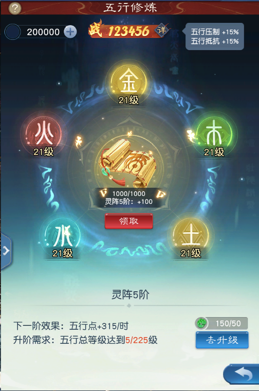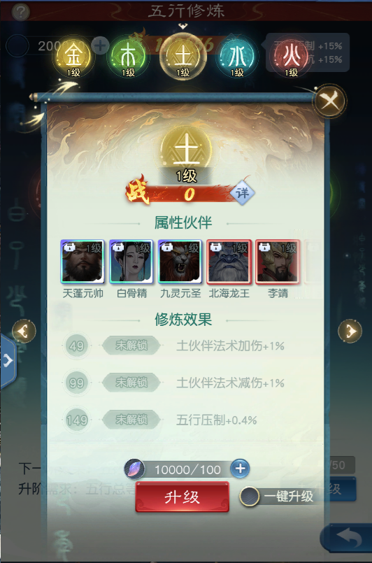 飞升后将率先开启一个全新系统-五行修炼。少侠们每日通过“五行灵阵”可收获五行点,使用五行点可进行金、木、水、火、土五行的等级提升,五行每50级可进行境界突破。而灵阵境界决定了五行灵阵产出效率,灵阵境界每提升一层,产出效率都将大幅提升。五行修炼将对伙伴系统产生系统而深远的影响;