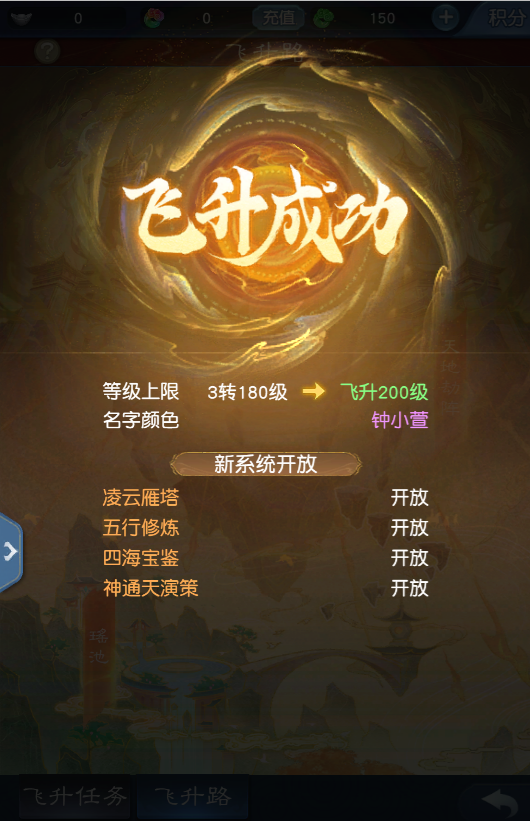 飞升后的少侠将实现修为跃进、突破自身所见所历的极限!成功飞升后将解锁更多新玩法新系统,诸多变化,还需少侠自己探索!