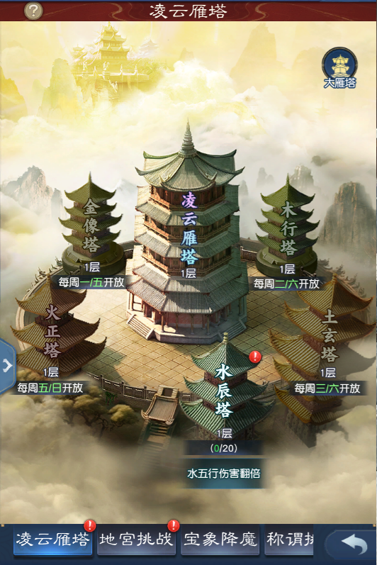 “凌云雁塔”中,凌云五行塔变化更大,全新的爬塔设计为飞升后的少侠们提供了更加强大的修行武器!
