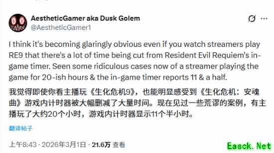 生化危机系列可靠爆料人 Dusk Golem 在 X 平台确认:“看主播玩 RE9 就能明显发现,大量时间被内置计时器砍掉。有主播玩了约 20 小时,游戏只记 11.5 小时,差距离谱。” 他初步指出,计时器会在过场动画、死亡重试、菜单操作(打开地图 /inventory/ 读文件 / 互动) 时暂停,属于 “纯 gameplay 计时”。
