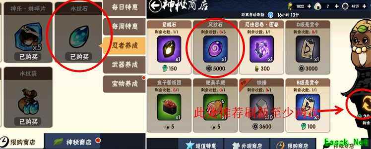 忍三中作战忍者的配置优先级为命格≥天赋>等级,因此在培养过程中,零氪玩家可通过积累石头、忍币、小屋碎片等资源来提升实力。建议在限购商店用属性石兑换石头,并在神秘商店用忍币购买石头,尽量买满。可每天花费40勾玉刷新神秘商店,以获取更多所需资源。