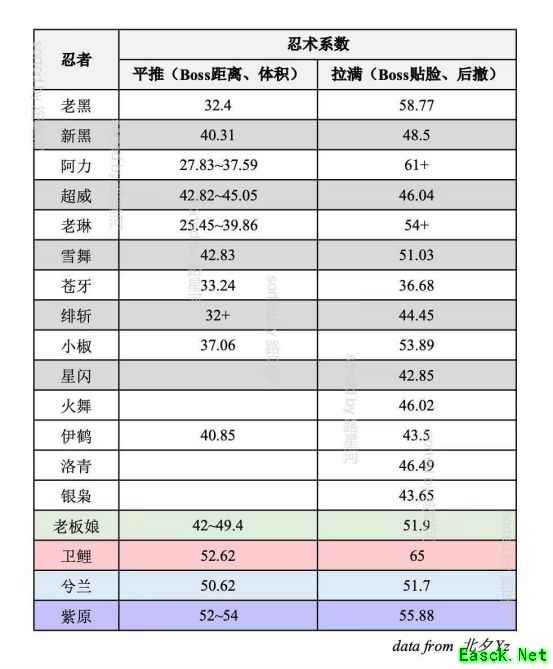 当前版本角色忍术系数如下,数据源自北夕Yz,表格由路星河整理。北夕Yz还整理了更详细的忍者系数表,包含不同命格情况。