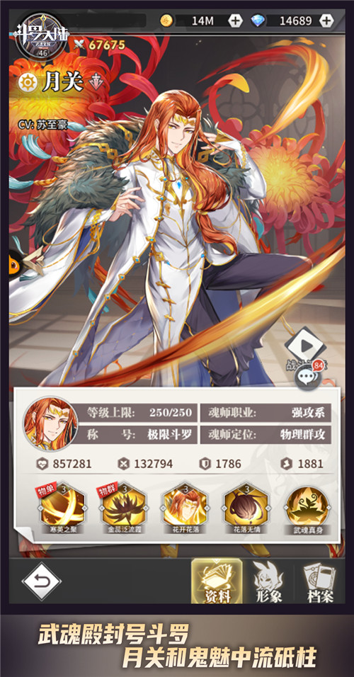 菊斗罗月关则是定位光属性的物理群攻,特点是随机性的高伤害。月关的成名技能“金蕊泛流霞”用六道飞刃随机攻击敌方,每伤害到一个非重复目标,伤害就可以大幅提高,如果战斗中没有击杀对方,下次攻击伤害还可以增幅。