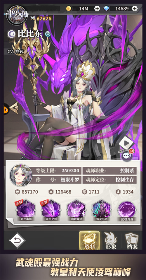 《斗罗大陆:武魂觉醒》手游中的教皇比比东可使用罗刹神的力量,其战斗特点是控制生存。“死亡毒蛛”技能 可以大幅提供伤害,还有概率掠夺对方的速度值,让比比东越战越强。而“永恒之创 ”技能可以给对方施加创伤状态,让敌方的生命值减半,同时释放技能会概率变为普通,让其生存和输出能力大幅下降,极大的限制了对方的实力。