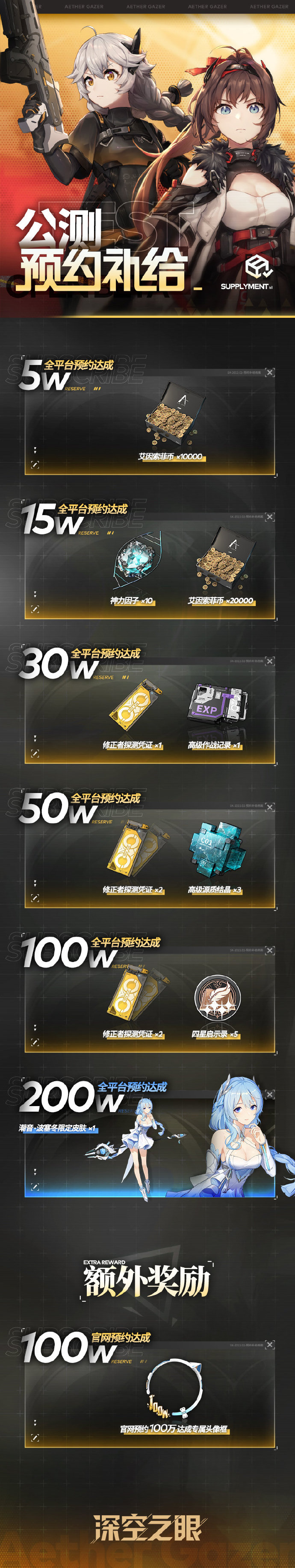 《深空之眼》将于4月22日正式公测,目前游戏全网预约已超过200万,除了一些游戏内物资外,官方还为玩家准备了修正者潮音·波塞冬的限定皮肤作为200万预约达成奖励,更是额外追加了25抽修正者探测凭证(累计可获得30抽)作为预约活动奖励,诚意满满,对游戏感兴趣的玩家可以抓紧预约啦!
