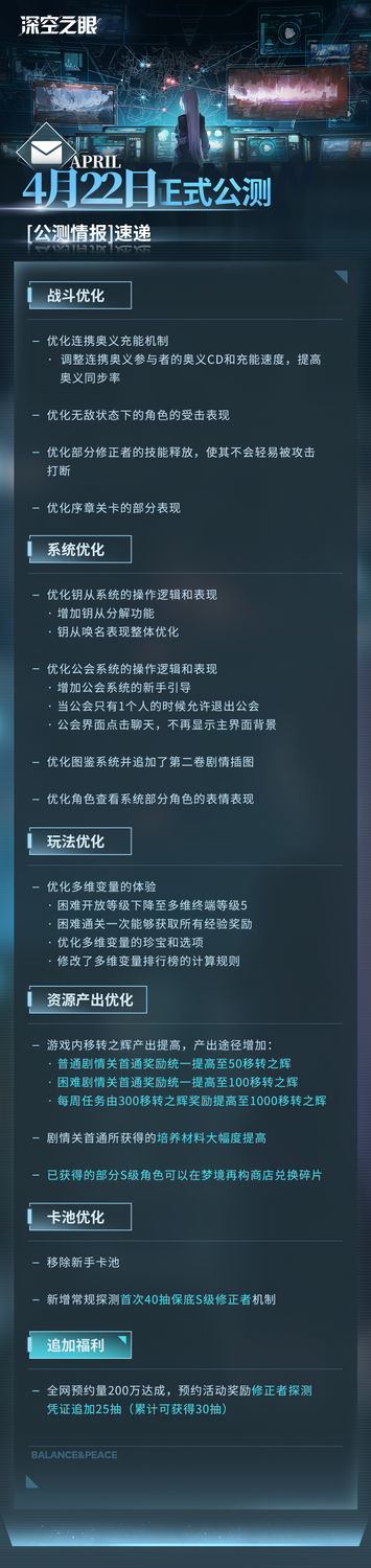《深空之眼》在「修正测试」期间收集了不少体验过游戏的玩家提出的建议,并在测试结束后进行优化改进,对于玩家最为关注的部分问题,在昨日的一同公开的优化公告中也给出了具体回应。其中包括了200万预约达成奖励将追加至30连抽,新增常规探测首次40抽保底S级修正者机制,剧情关所获培养材料翻倍等多个优化方向,诚意满满,令人期待。