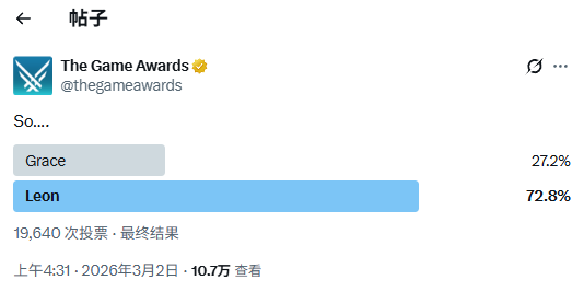 近日,TGA官方账号在社交媒体X上发起了一项投票,邀请玩家在《生化危机9:安魂曲》的两位主角——里昂·S·肯尼迪与格蕾丝·阿什克罗夫特之间做出选择。截至发稿时,该投票已收集超过1.96万份反馈,结果毫无悬念:里昂以72.8%的得票率大幅领先,而格蕾丝仅获得27.2%的选票。