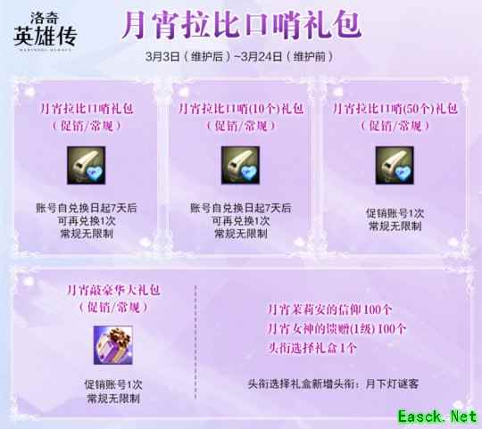 在3月3日维护后至3月24日维护前,月宵女神的馈赠(1~4级)限时上线,英雄们可从中获得月宵女神的馈赠综合礼盒、月宵光耀翅膀礼盒、S级特别版热辣套装选择礼盒、S级特别版晨露女仆套装选择礼盒、S级特别闪耀版月光女士套装选择礼盒(可选择特别闪耀版月光女神套装或特别闪耀版月光雪纺罩衫套装)以及S级苍穹之剑套装等。