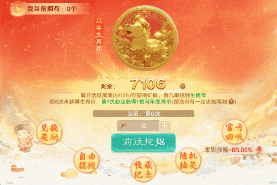 除了收藏价值和官方回收,今年生肖币还可以兑换生肖马主题限定外观、珍稀神兽、马主题座驾、马主题时装、龙马凝神丹、元气丹、幻肤丹、高宝图等20多类稀有物品,解锁更多游戏乐趣!