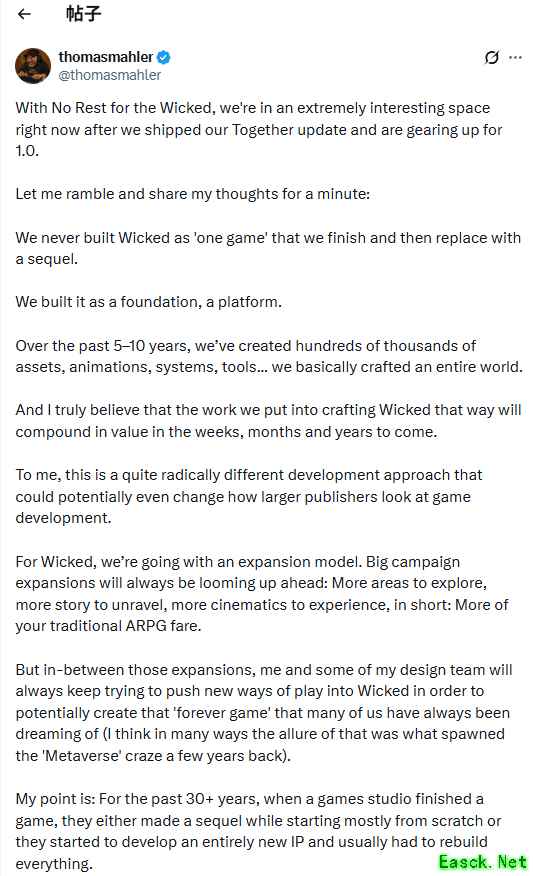 Mahler进一步表示:“如果我们执行得当,不做任何愚蠢的事情,《恶意不息》有可能成为首批真正的‘永恒游戏’之一,而其‘终局’体验将远远超出传统ARPG的范畴。”他解释称,这并非意味着无休止的重复刷取内容,而是希望玩家在想体验不同玩法时,无需离开游戏本身,“只需在游戏内部进行切换即可”。