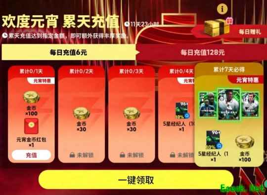 在【欢度元宵 累天充值】活动期间,玩家每天充值都可以获得返利奖励,累计充值7天还可获得金币和5星经纪人(10%含评分96+高光)!