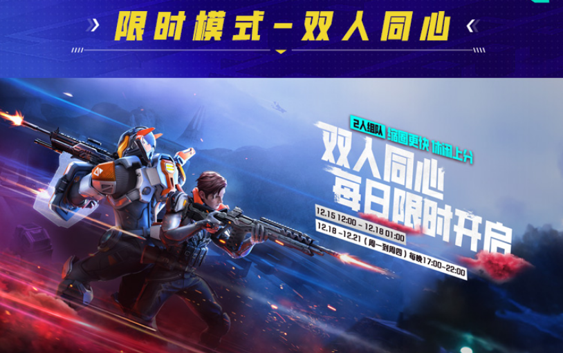 12月15日-18日,双人同心模式限时开启,体验双人同心模式,休闲上分,完成任务领皮肤碎片、能量币等好礼!