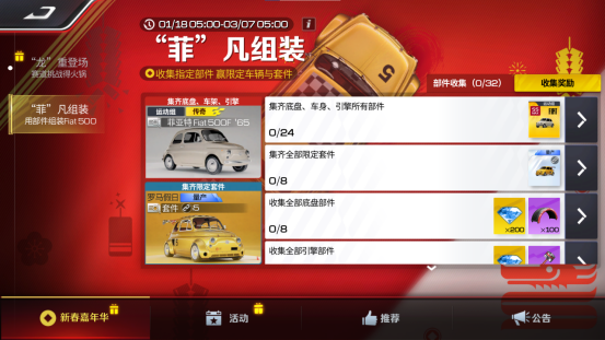 1月18日至3月7日登录巅峰极速,参与排位模式并战胜指定对手,可获得随机车辆部件。集齐底盘、车身、引擎、套件共32个车辆部件即可领取运动组传奇车辆菲亚特 Fiat 500F '65和车辆限定套件“罗马假日”!车手们还可以进行部件交换,好友互帮互助,可以缩短收集时间更早拿到心仪奖励!免费领新车,欢聚过新春!