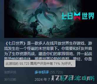 在网易年中上线的新游队列里,有这么一款看起来非常特别的游戏——《七日世界》。 特别在于,从营销上,对比起网易其他几款“发疯式”营销的产品,《七日世界》显得过于低调;从题材上,超自然开放世界显得别具一格;从渠道上,它又是少有的在Steam先发的产品。 即便因为各式各样的如游戏优化、服务器的偶尔卡顿的原因,《七日世界》上线初期的好评率显得有点不尽人意,但随着时间的推移我们发现,其游戏的DAU不仅稳定在20万左右,好评率也回暖到了“多半好评”。