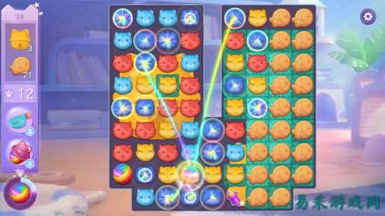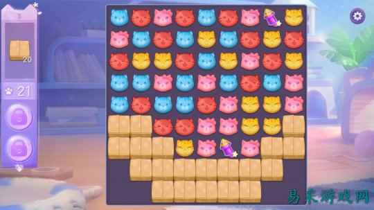 当然这都不是重点,消除游戏的核心关注点自然还是消除做的好不好玩。而《喵与筑》在消除部分的表现可以说可圈可点,其整合了目前大部分三消游戏玩法层面的设计,令其拥有得天独厚的丰厚内容和精致性。游戏以最基本三消规则为基础,加入多样化的关卡目标以及阻碍,像是需要同色消除才能解开禁锢的标记,或是需要多次消除的障碍等等。
