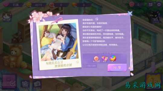 最后,游戏还允许玩家花费赚到的金币或是直接氪金添置各种家具、道具来装扮晓晓的房间与奶糖主子。这些纯装扮的元素并不会让三消变得更简单,但却能够激发玩家的装扮欲与收集欲。看上漂亮的套装给主子买买买,买不到就到工坊里制作,若是有闲钱也可以买上几套氪金限定也OK。 除了三消与装扮,《喵与筑》的另一个乐趣核心就在于贴近于于现实的故事剧情。故事始于晓晓雨中捡到被遗弃的奶糖,以一个养猫新手的视角逐步演绎人与猫之间的成长与情感升级,有着近似于AVG式游戏的体验。贴近养猫人现实的行文对白存在着不少让人会心一笑的情感触点,足以激发养猫人的好感。