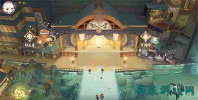 此次《代号SSR》的测试其实并没有开放过多的内容,仅仅展示了游戏的抽卡、组卡、对战等核心环节。游戏的主界面设计成上中下三层式结构,商店门口一池露天温泉,四处都有闲逛的妖怪,再往上走有一个平台边上分立两栋高楼,一个个游戏功能就以店铺的形式分散在了游戏的场景之中。到了最上层一个一只巨大的锦鲤船隐藏着尚未开放的内容,大概会作为游戏的PVE内容,或某种创新玩法的承载地,但这不在本次测试的范围内,我们就暂且抛开不谈。