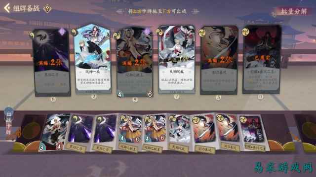 要了解游戏的整体框架,首先你必须知道游戏中的卡组构成。玩家在组卡页面能够对每个式神的卡组进行配置,目前已开放有11个式神,每个式神有6种不同的技能卡牌,并且在编组时最多只能携带8张技能卡牌,同一种卡牌最多可编入两张。卡牌根据使用功能分为形态、战斗、法术三种不同的使用方式,在下面的实际运用时再做说明。