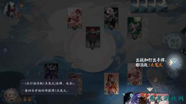 《代号SSR》并不是像《炉石传说》那样每回合给你加1点费用,而是直接固定两点“鬼火”作为玩家行动的资源。使用卡牌(带瞬发的卡牌不消耗)或派遣式神进入战斗区域都会消耗一点“鬼火”。也就是说,游戏通过有限的“鬼火”来限制玩家每次行动的效率。