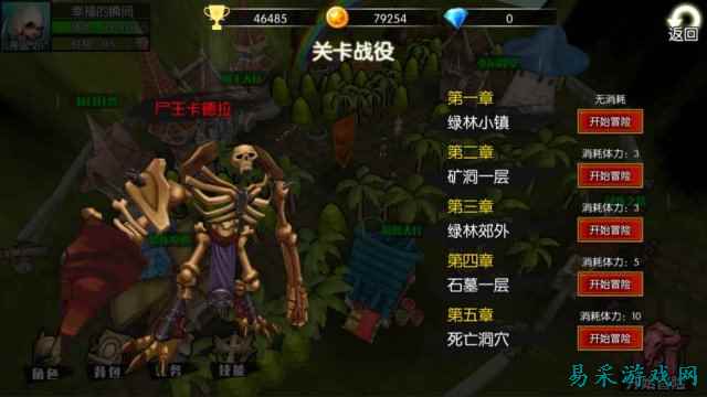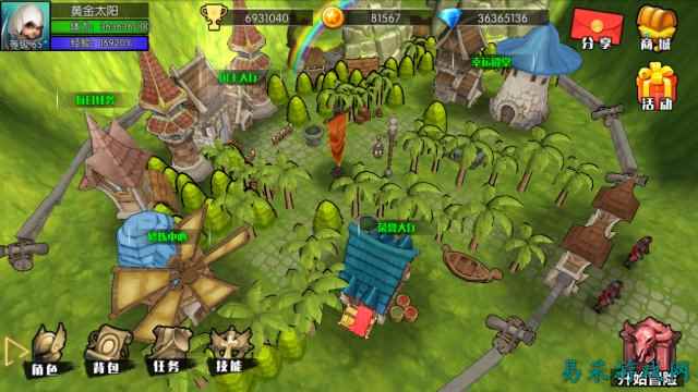 目前游戏分为主城和冒险地图两个部分。主城包括国王大厅(定时收取资源、升级解锁各项功能)、荣誉大厅(物资装备兑换处)、幸运殿堂(十连坑处)、修炼中心(领取经验和金币的地方)和每日任务5个部分,是游戏中的挂机、收益、探宝和购买兑换物资装备的地方。