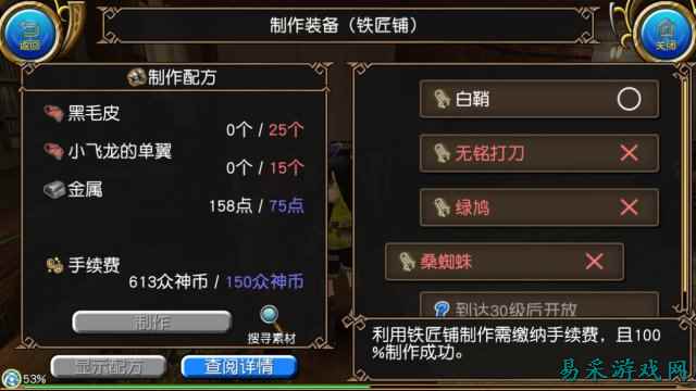 装备和药品都可以通过制造获得,而制造的材料就存在于“刷怪”这一项艰巨的任务中。玩家通过刷怪获得木头、牙齿、皮革、钢铁等多种材料,在合成匠那里根据需要兑换成素材点,通过足够的素材点和指定的材料进行装备和物品的制作,简单来说就是自己动手丰衣足食。