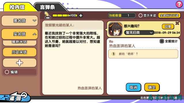 武斗祭玩法由于其三种模式限定了各式各样的规则,使得战斗更加充满刺激性和挑战性。 除此之外,最具特色的就是本作的信箱和言弹玩法了。这两种玩法并非本作的核心玩法,却让本作像是有了灵魂一样活了过来。信箱玩法是校长和小姐姐们交流的平台,小姐姐们有事没事就会往信箱里寄信,类型分为匿名信和实名信,匿名信不可回复,但是玩家可以从校长的角度窥探学员的小秘密,动态了解剧情故事,还可以探查支线剧情;实名信可以回复,能加强与学员间的好感度,就好像真的与小姐姐在聊天一样,让游戏具备了灵魂。