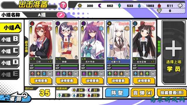 林莉的战斗姿态 第一个就是学员的编组。学员的编组可不只是简单地编组。因为战斗地图分为多条线路,多个点位,每个点位的寻路要求是不一样的,上面说过学员分为五个属性、四个学院,而且出战的COST值(即行动值,随着玩家的等级提升而提升)是有限制的,因此出战前选择好对应的学员是能否全条件通关的必备要素。