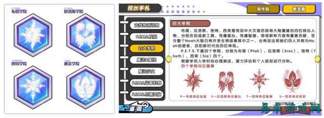 学员们一共分为四个学院,四个学院各有其徽章,其校服、背景故事都各不相同,但是这并不影响学员的属性和种族,因为很多时候都是一个小姐姐一个种族,划分学院更多情况下是为了剧情的需要和背景故事的完善。