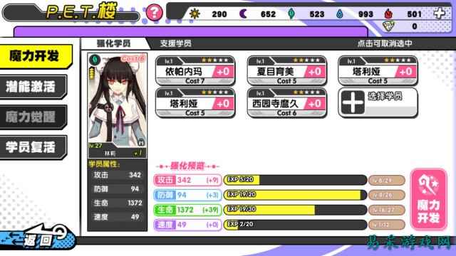 对于喜爱的小姐姐,我们下一步就要进行培养。在PET楼中玩家可以对学员进行魔力开发(强化)、潜能激活(提升卡牌潜能等级)、魔力觉醒(强化技能、削减行动值)以及复活,这是针对学员战斗方面进行的强化。