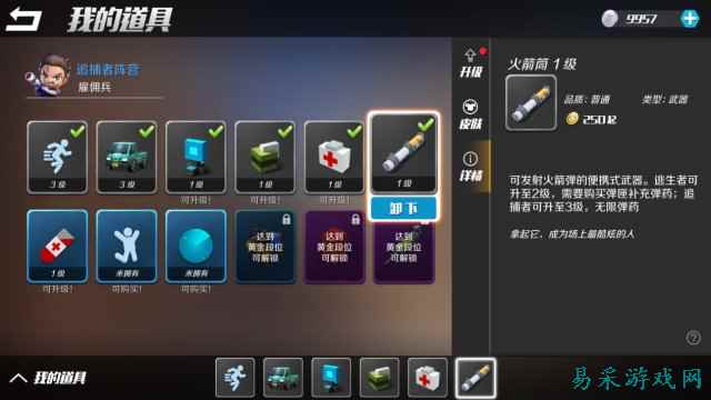 但地图虽小,道具却一应俱全。首先来看场外因素,玩家达到黄金段位一共可以解锁十二种道具,但上场时只能携带6种道具,包括皮卡、医疗箱、火箭筒等等,道具都可以进行升级。这里除火箭筒以外其他功能不分角色。