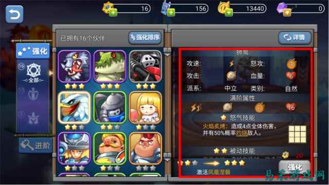 伙伴养成主要分强化和进阶两项。强化可以提升伙伴星级,从而解锁技能;而进阶则是提升伙伴属性。具体属性如下图,攻速指攻击间隔时间,怒攻指技能伤害点数,攻击指普攻伤害点数,血量自不必说。