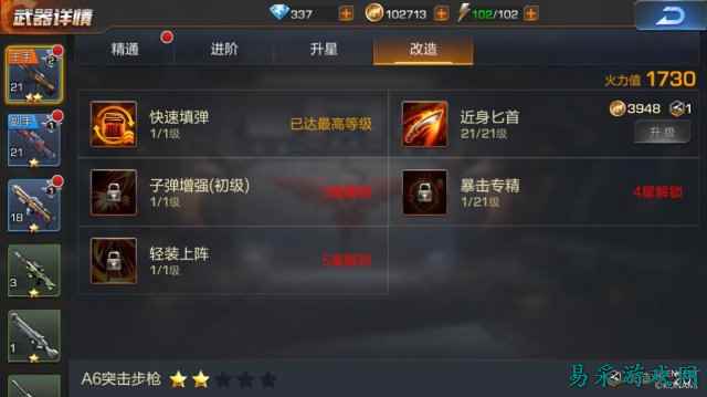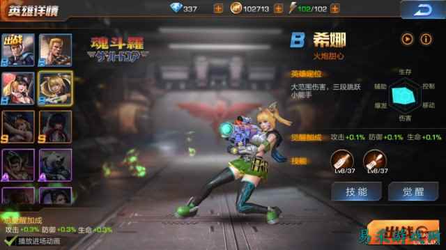武器改造可以拥有更为强大的属性 除了经典的闯关以及后期解锁的组队闯关(可以借命哦),游戏还提供了丰富的PVP模式。在英雄战场中,每方玩家可以选择3名英雄1个特技以及3个必杀技进行对抗;并且战斗场景中还有野怪和补给可以拾取。类似格斗游戏的轮替战,同时也融入了MOBA游戏的等级以及技能机制,这样的新玩法还是十分值得我们去体验一番的。而在同类型的横版射击游戏中,也并没有出现过这样的玩法模式;这种轮番上阵的KO擂台式PVP玩法兼顾了射击游戏的操作性以及英雄阵容选取上的策略性,操作与智慧并重,这样的玩法还是可以点赞的。