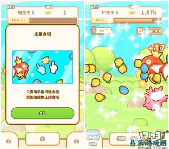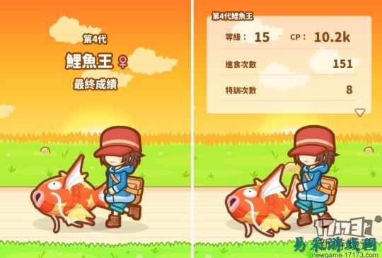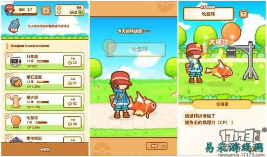 游戏的培育方式也十分简单明了,喂食—特训—联盟赛。玩家只需要点击鱼池中的树果可以对鲤鱼王进行喂食,从而增加CP值(跳跃能力);