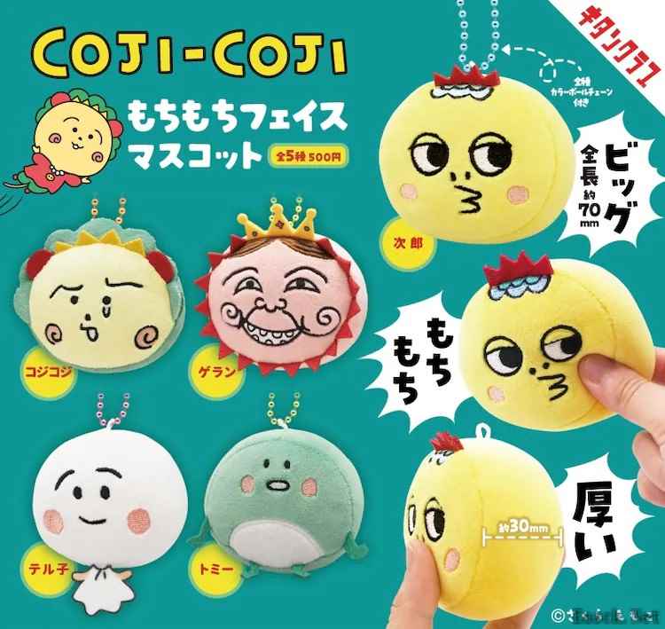 2025年4月25日起,根据さくらももこ创作的《コジコジ》推出的“コジコジ もちもちフェイスマスコット”将在全国范围内发售,每次扭蛋价格为含税500日元。这款玩偶采用柔软且富有弹性的面料,拥有令人喜爱的软糯触感,尺寸约为7厘米长、3厘米厚,角色的脸部被立体化呈现。此次推出的角色包括コジコジ、次郎、ゲラン、テル子和トミー,共5种款式。