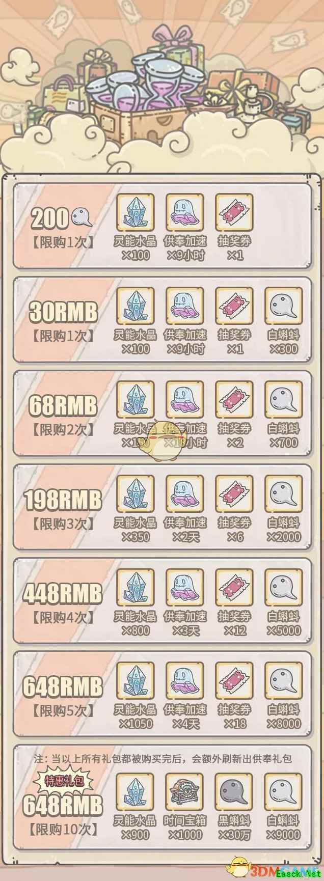 活动期间,每天会在贩售机中出现福利礼包,每天5点刷新,售价1白蝌蚪。 内容为:供奉加速×30分钟、开发者的灵魂×1、灵能水晶×100 三、神坛秘仪 活动期间,每次领取供奉奖励,根据祭品原始的供奉时间,获得活动积分(1小时=1积分)累积对应的活动积分,可获得以上奖励。 四、神迹的见证