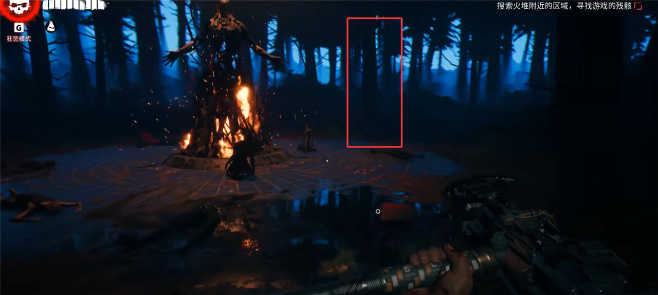拾取日志3之后听完录像带前往下图圈中的树边,之后击杀从树中出现的带名丧尸,并等待最终竞争对手过来。