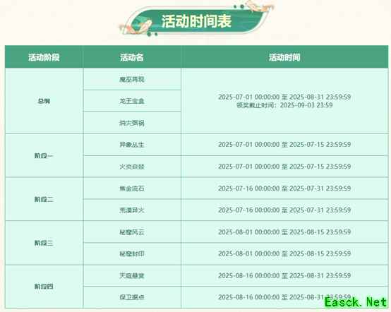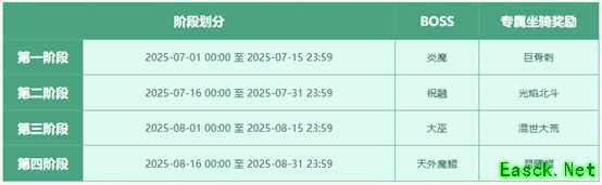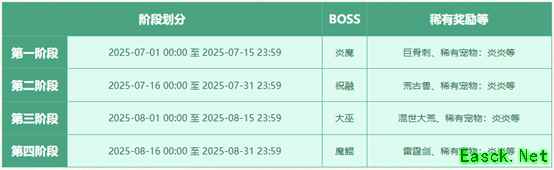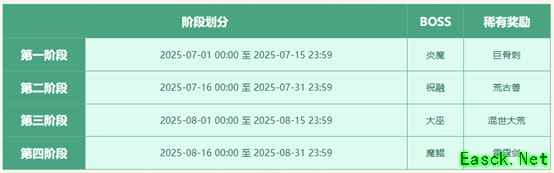 各阶段时间划分,及BOSS携带稀有奖励(达到一定战力的玩家可获得稀有奖励)如下: