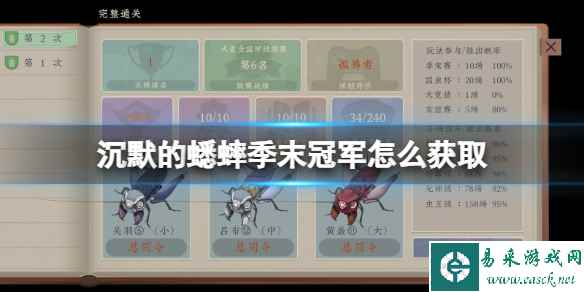 《沉默的蟋蟀》季末冠军怎么获取沉默的蟋蟀游戏里不少成就都是需要参与一些比赛的,比如有个季末冠军的奖杯需要夺得季末赛冠军...