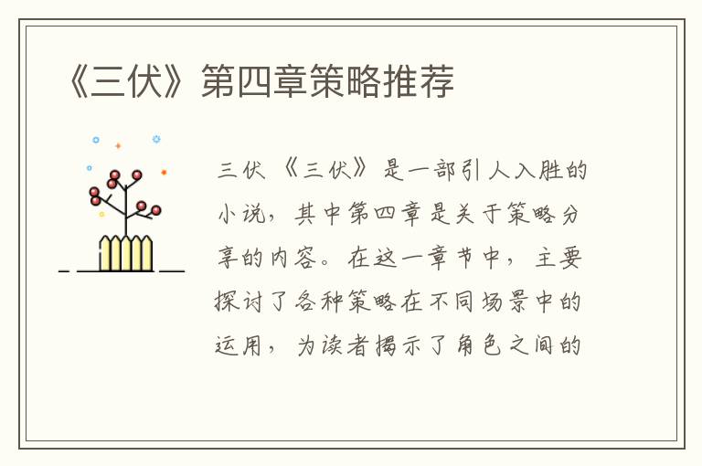 《三伏》第四章策略推荐三伏 《三伏》是一部引人入胜的小说,其中第四章是关于策略分享的内容。在这一章节中,主要探讨...