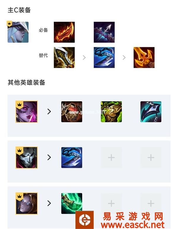寒冰主C,羊刀轻语无尽,几乎没办法替换,很多人喜欢给巨杀打前排也很痛,但其实玩艾希就是靠技能的大范围去击杀后排,尤其在更新之后技能范围再加一格,艾希在面对一两个前排的阵容完全可以直接把后排切死,之后再围殴前排就好了,所以巨杀的优先级绝对是不如无尽轻语的。