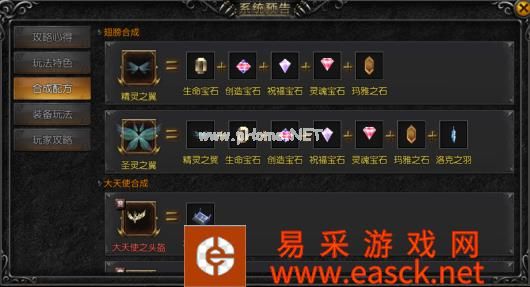 合成配方展示的是玩家前期关注度比较高的多个合成道具的材料构成,翅膀、大天使装备、果实。能够让大家在日常游戏时不必跑到合成大师处就可以掌握全局。