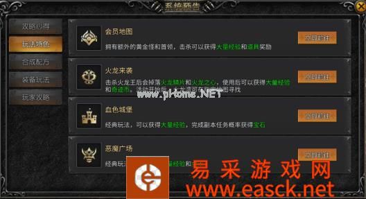 玩法特色页面给大家展示了四个游戏内非常重要的内容,分别是会员地图、火龙来袭、血色城堡及恶魔广场。并且对个个内容做出了详基本的解释,方便玩家了解各个内容的基本情况,再根据自身情况合理安排活动。这些内容都安排了前往链接,十分方便。