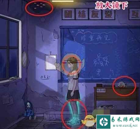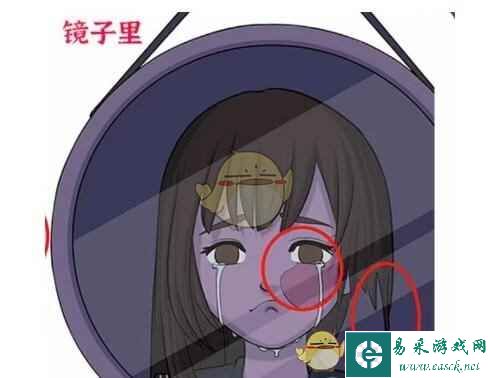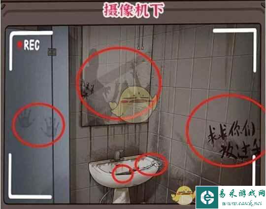 3、摄像机下可以找到欺负女孩、墙上的字、水池里的头发、剪刀、手印,镜子里可以找到女孩脸上的伤和凌乱的头发。